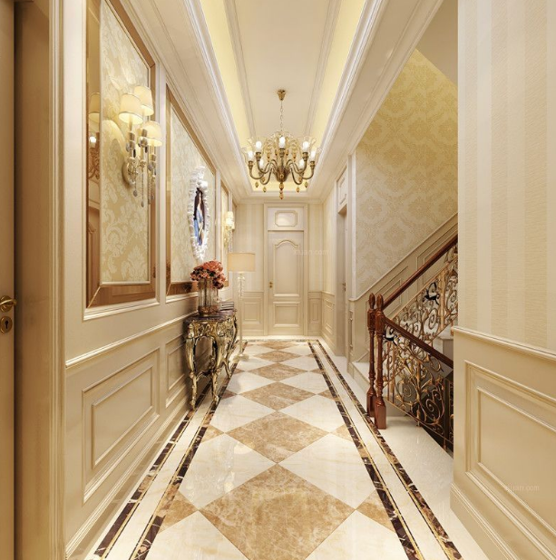 在走廊上铺上地毯、花砖等也是一种不错的办法,通常说来,地毯铺设时,长度不要铺满整个走廊,以达到视觉分割的目的。