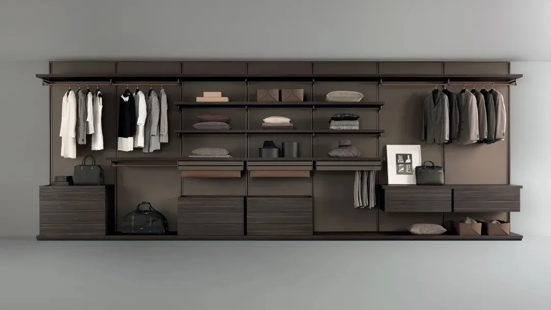 柔美舒适的灯光、金属质感的挂件、富有温度的板材,烘托出主人高贵典雅的居家生活。强大的挂墙系统,长短隔板的运用,分割出不同的空间,增加了衣柜的收纳功能。多元素碰撞出简洁利落的幽雅,使得挂墙式衣帽间成为心之所往。